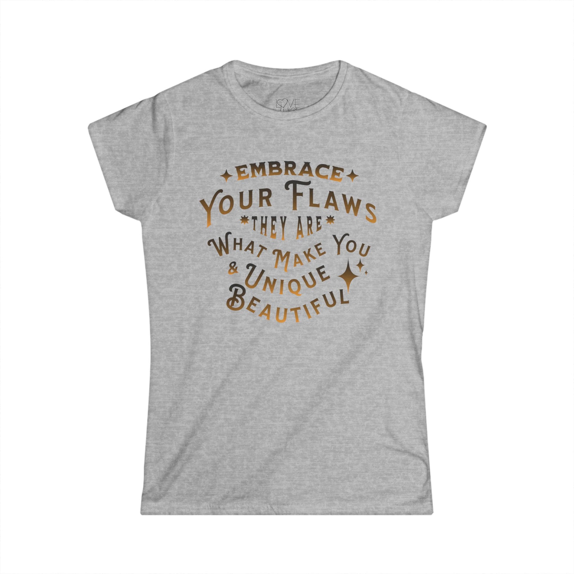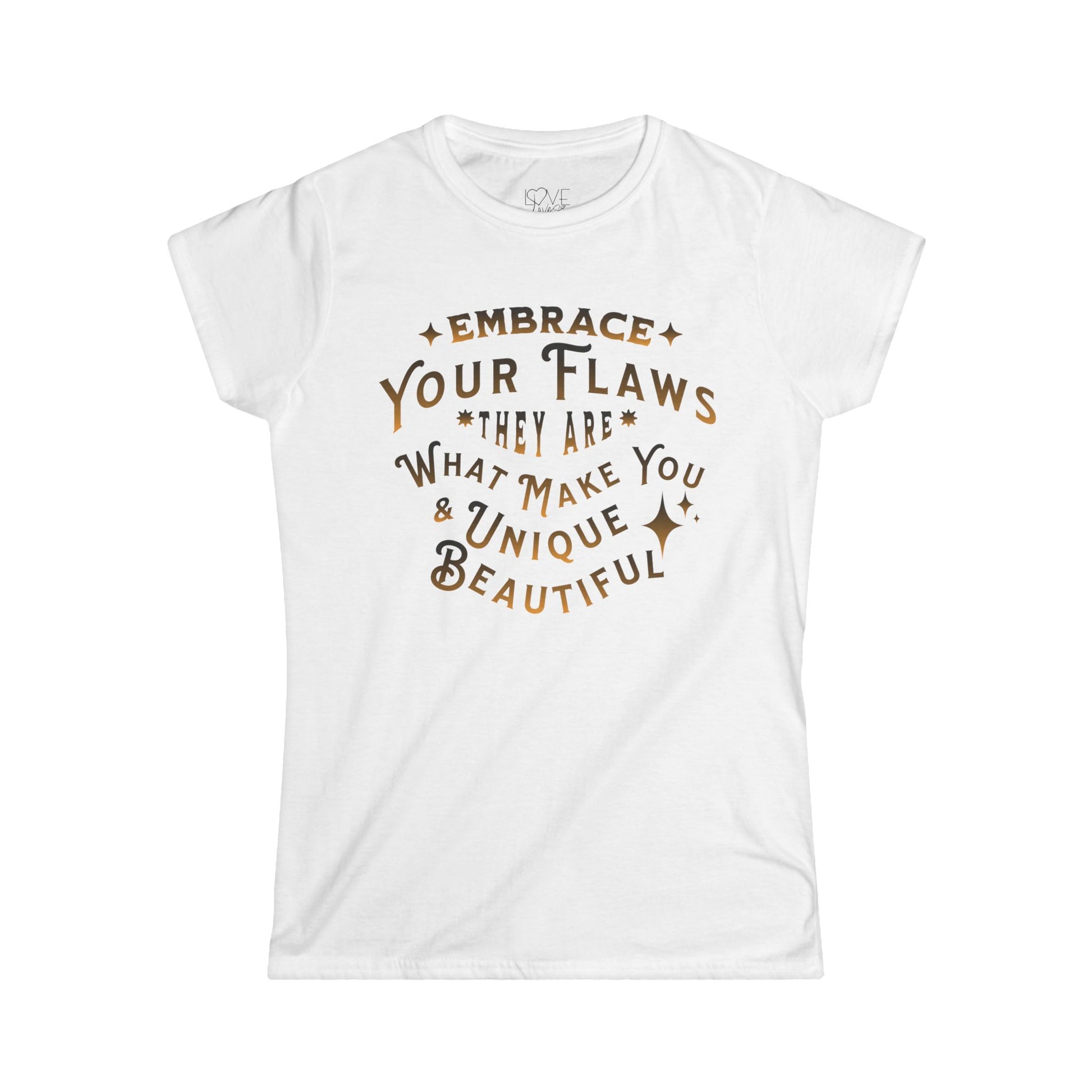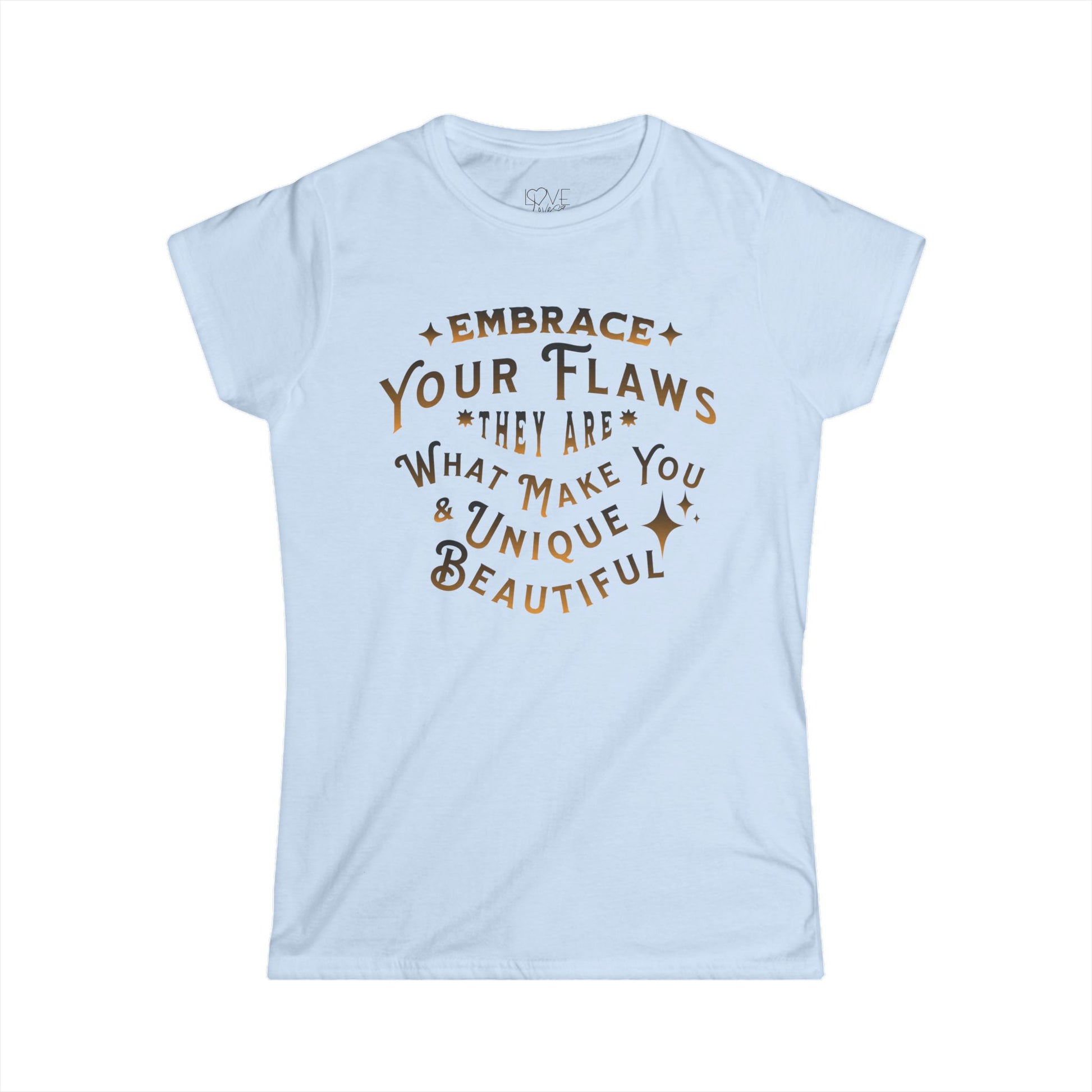 The "Embrace Your Unique" Women's Tee is perfect for those who embrace their flaws and individuality. Made with soft and comfortable materials, this tee is perfect for women who want to spread the message of self-love and acceptance. Show the world your beauty and uniqueness with this stylish and meaningful tee.